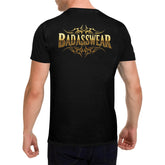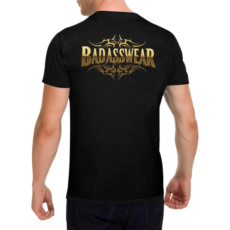 The shirt features a striking, gold-toned BADASSWEAR logo printed on both the front and back. The logo on the front is modern and eye-catching, while on the back, it is combined with a unique tribal pattern, creating an impressive and distinctive look. Our advanced printing technology ensures the gold color stays vibrant and vivid wash after wash, without cracking or fading.