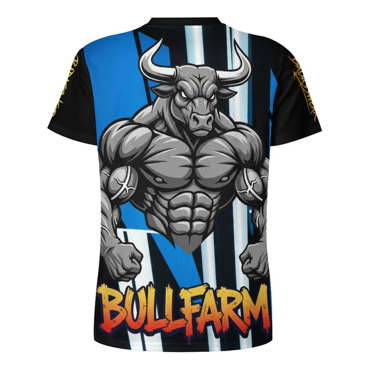 This t-shirt combines comfort and bold style. Made from soft, breathable mesh fabric, it features a striking design with a muscular bull graphic on the back and "Bull Farm" text. The front has a sharp, abstract pattern and "Badass Wear" branding. It's a versatile, comfortable tee that makes a statement.