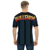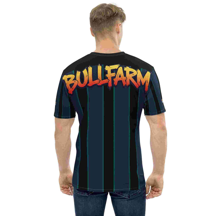 The t-shirt's print is a striking combination of classic and modern. The shirt features vertical, dark blue and black stripes, accented with thin, turquoise lines. This graphic pattern creates a sharp and athletic look. The stylish "Badass Wear" logo is on the left chest and right sleeve, while the back is adorned with a bold and distinctive "BULLFARM" text with a flame-like, orange-yellow hue. The black panel on the upper back and shoulders gives the shirt a modern and finished look.