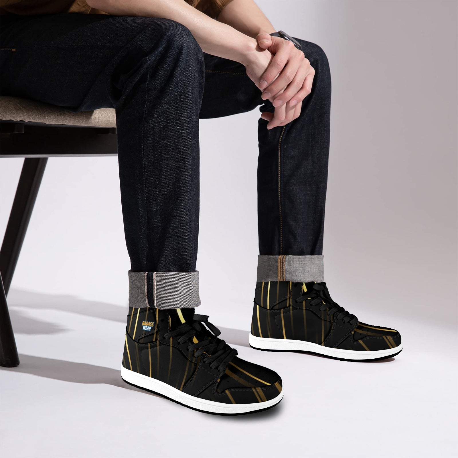 Step up your style game with these custom high top sneakers. Combining a classic silhouette with a bold, modern twist, they're the perfect addition to any streetwear collection. The sleek black base is elevated by the dynamic gold stripes, creating a striking look that’s both luxurious and effortless.