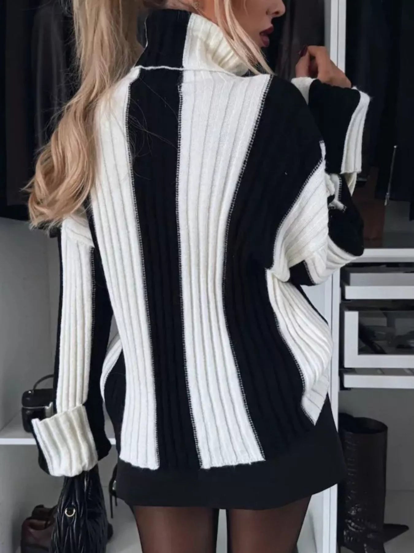 Make a bold statement with our Color Block Ribbed Turtleneck Sweater. This eye-catching piece combines a classic ribbed texture with a modern color block design, creating a unique and stylish look. The relaxed fit and wide turtleneck ensure both comfort and a chic silhouette, making it an ideal choice for any occasion, from casual days to a night out.
