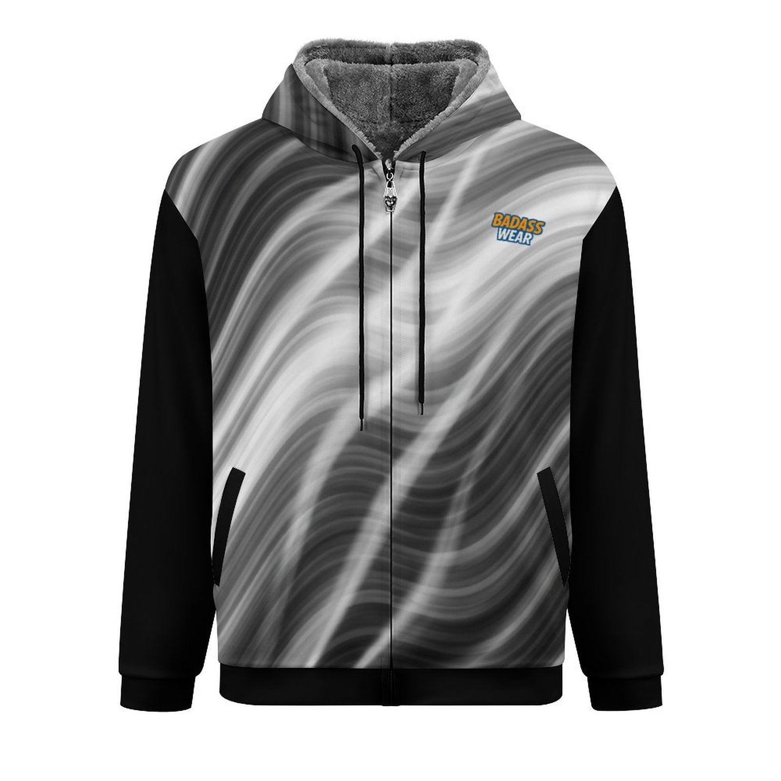 Introducing the perfect blend of comfort and style: the Men's Double Layer Fleece Zippered Hoodie. This hoodie features a unique black and white abstract wave pattern designed to make a statement. The front has a full-length zipper and two convenient pockets, while the fleece-lined hood provides extra warmth.