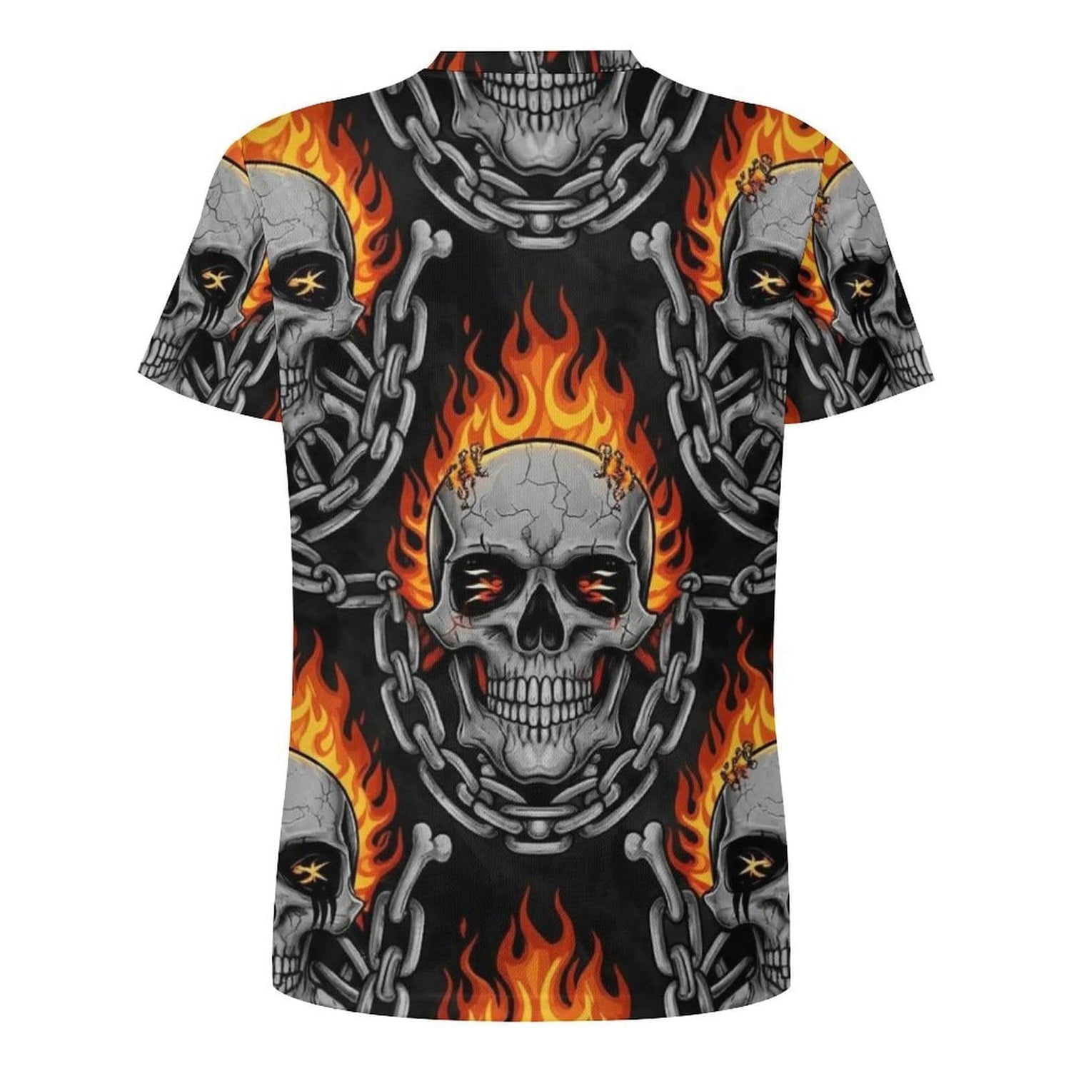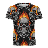 Make a powerful statement with the Flaming Skull Ice Silk T-Shirt. This all-over print features a mesmerizing pattern of cracked skulls with glowing red eyes and fiery flames, all wrapped in a heavy metal chain design. It's a look that's as rebellious as it is unique.
