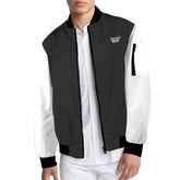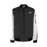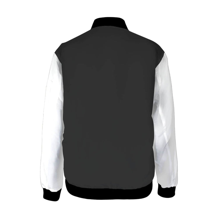 This black and white contrast bomber jacket offers a sleek, modern look with a classic athletic feel.
