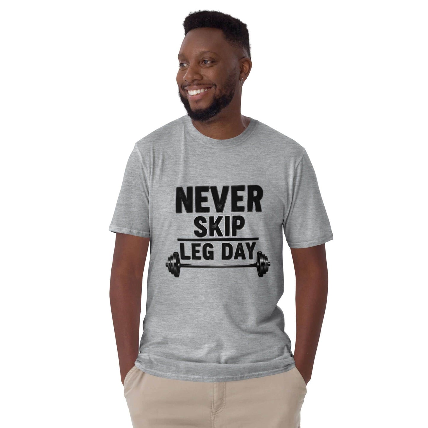 This men's t-shirt is a cornerstone of every gym-goer's wardrobe. Not only is it extremely soft and comfortable, but its message is clear: "Never Skip Leg Day." The shirt is the perfect choice for the gym, casual wear, or as a gift for someone who is serious about their training – or who can laugh at themselves!